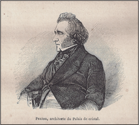 Quando a rainha da Inglaterra inaugurou, a primeiro de maio de 1851 a Exposição Universal de produtos da indústria de todas as nações, ela penetrou o recinto do edifício à frente de um cortejo que, embora sem pompa e solenidade de cerimônias oficiais, foi constituído por embaixadores, ministros, pelo arcebispo de Canterbury, por altos militares, por oficiais e damas-da-Côrte. Essa série de autoridades foi aberta pelo arquiteto do palácio da Indústria, Joseph Paxton (1801-1865), além dos dois empresários da exposição. A tarefa de Paxton foi a de desenhar e de criar jardins com efeitos pitorescos; tinha sido empregado do duque de Somerset, passando a seguir ao serviço do duque de Devonshire, em Chatsworth. Este nele reconheceu um profissional de qualidades administrativas e de grandes conhecimentos, passando a empregá-lo na administração de seus domínios na Inglaterra e na Irlanda.