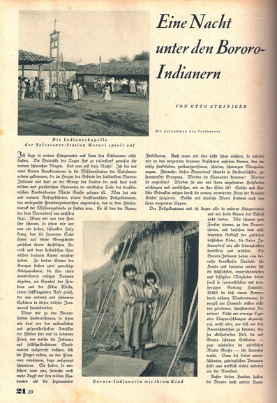 "Eu estou deitado na minha rêde e não consigo adormecer. As impressões do dia foram fortes demais para serem facilmente digeridas. E agora sobretudo essa noite! Vim numa pequena caravana de automóveis à estação missionária da ordem salesiana, que está situada no coração do território dos índios Bororo semi-selvagens e bem nos limites da terra dos Xavantes, ainda hoje selvagens e perigosos, na parte mais ao norte do estado brasileiro de Mato Grosso. Deram a mim e ao meu companheiro de viagem, um tenente da polícia brasileira, o quartinho de hóspedes mais afastado que pôde ser encontrado nesse quadrado de casas dos edifícios da missão. Esse é o lugar que está mais próximo da aldeia Bororo. Quando olhamos pela janela, vemos à nossa frente uma cruz de madeira, alta, fina, que os piedosos salesianos ergueram nessa fronteira divisória entre a sua área cristã e a pagã de suas escuras crianças selvagens. De ambos os lados da cruz levantam-se duas palmeiras reais magestosas, que a ela fazem uma maravilhosa moldura serena, um símbolo de paz e de silenciosa consagração, como um apelo doce que soa do alto, de outras e mais belas esferas para os baixos deste vale de lágrimas terreno." (op.cit.)