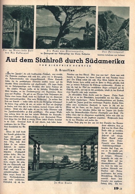 A viagem que o ciclista Siegfried Schütze, vencedor do circuito Rund um Berlin, de 1926, realizou pela América do Sul, de 1929 a 1934, incluiu o Brasil na sua primeira parte. O relato dessa viagem foi publicado em 1935 ("Auf dem Stahlroß durch Südamerika 2. Brasilien", Durch alle Welt 19,1935,13-19).