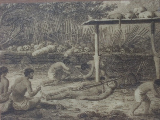 "Nas ilhas Sunda e sobretudo em Borneo pode ter sido trazido pelos Hindus que colonizaram essa grande ilha, e cremos que os Bugis de Borne os trouxeram a Celebes e de lá às Carolinas e às outras ilhas da Polinésia, ali implantando-os, onde, com a ignorância dos selvagens, tomaram um caráter horrível. Também existe em algumas ilhas da Melanesia. Além do mais, os árabes, chineses, japoneses e talvez também os hindús visitam em parte as ilhas que existem em diferentes partes da Oceania." (pág. 25)