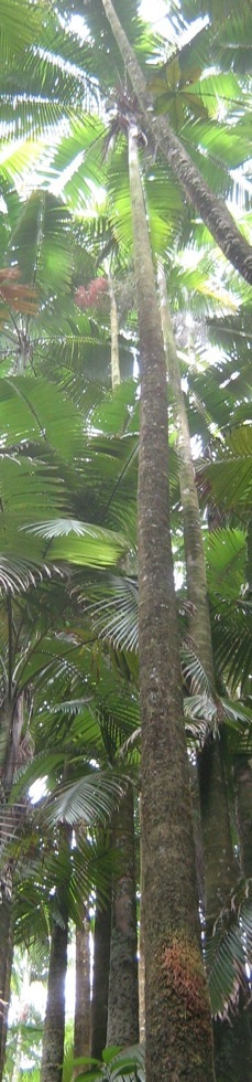 Essas palmeiras foram introduzidas no Havai na segunda metade do século XIX, provenientes do Norte de Queensland, Austrália. Desempenharam o papel da palmeira imperial do Brasil, sendo utilizadas no paisagismo, marcando a paisagem de Hilo (Hilo Palm, palmeira real). Tendo encontrado condições ideais para o seu desenvolvimento, esse imigrante vegetal expandiu-se espontaneamente pela costa oriental da ilha. Sofreu, porém, com o desenvolvimento das plantações de açúcar, sobrevivendo no vale húmido da baía de Onomea. Aqui, algumas espécimes mostram ocorrências extraordinárias, explicáveis pelo habitat, tais como a de raízes que saem do caule, conhecidas como "raízes adventícias".