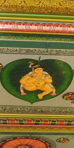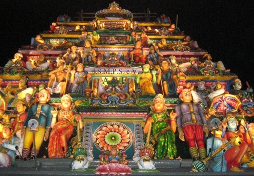 Ladeando a torre, vêem-se as imagens de Murugan, à direita, e Krischna, à esquerda. A entrada é dominada pela magestade das portas, que impressionam aqueles que entram no templo, que se tornam conscientes das dimensões ínfimas da existência nas profundidades e que assim se preparam para o processo ascensional.
