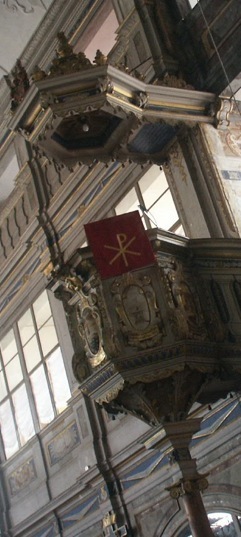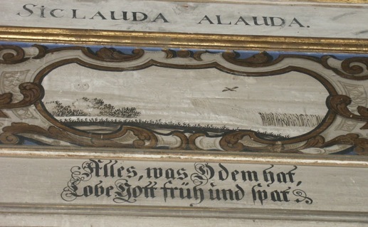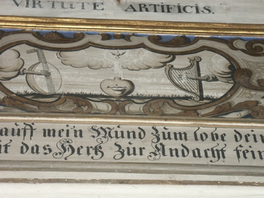 Uma particular atenção merecem os dizeres pintados nas paredes da Igreja e as suas relações com as respectivas funções dos espaços. Sobre o altar, lê-se, em hebraico, Jahwe, e sobre o órgão, Halleluja. Textos e expressões elucidam ou especificam imagens; assim, sobre a figura do amor, lê-se o texto Mihi omnis Iesus. Duas inscrições surgem como de particular relevância para a compreensão de sentido da linguagem visual. Na tribuna do órgão, lê-se lauda a lauda, indicando que tudo o que tem odem deve louvar ao Senhor. Também pode-se ler virtude artificis, no pedido a Deus para abrir a boca daquele que ora para o louvor.