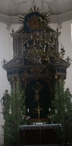 O altar, com uma grande imagem de Jesus Crucificado, é ladeado por três figuras alegóricas, representando a Fé, a Esperança e a Caridade. Referências alegóricas são encontradas em outras partes do edifício, profusamente ornamentado. A decoração do teto é particularmente notável nas frisas dos condes de Schönburg. No teto da nave central vê-se o olho de Deus, - o triângulo do qual irradia raios - e o monograma de Cristo.