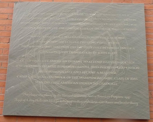 Uma placa colocada pelo Harvard University Native American Program, em 1997, lembra que o Indian College foi o primeiro edifício em alvenaria da universidade, de acordo com o escopo da universidade em proporcionar educação tanto a jovens ingleses como a indígenas. No edifício localizava-se a imprensa universitária, onde imprimiu-se a primeira bíblica da América do Norte. A placa recorda de vários nomes dos primeiros indígenas que ali estudaram, salientando Caleb Cheeshahtteaumuck, da tribo Wampanoag, o primeiro graduado do College, em 1665.