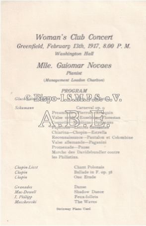 No dia 1 de fevereiro de 1917, às 20.00 horas, a pianista brasileira ofereceu um recital no Washington Hall do Woman's Club de Greenfield, Massachussets. Também esse club possuia uma tradição vinculada à história abolicionista.