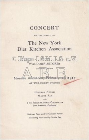 Para colaborar com os objetivos da entidade, Guiomar Novaes, juntamente com a soprano Maude Fay (1879-1964) e a The Philarmonic Orchestra, sob a regência de Josef Stránsky, ofereceu um concerto beneficiente na grande sala de baile do tradicional hotel Waldorf-Astoria, na tarde de segunda-feira, dia 19 de fevereiro de 1917, às 14:30 horas.