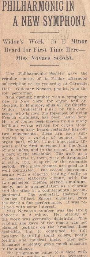 While the Metropolitan Opera House perseveres in its amazing neglect of French music (think of Faust not being given there for several seasons, although, if done as well as Carmen, it would draw equally large audiences), our concert halls are flooded with Parisian products. The Philharmonic joined the procession yesterday afternoon by giving a programme devoted entirely to French music, excepting the Grieg concerto. It began with Widor's third symphony for organ and orchestra, which was a novelty to New York audiences. It seems to antedate the Debussy epoch, for it is full of Wagnerian allusions, which are the best things in it. (...) It was well done by the orchestra, and Mr. Stransky also made the most of the other French pieces on the programme: César Franck's symphonic poem, The Wild Huntsman, and Chabrier's brillant rhapsody, España. Franck's piece is less austere than most of the other works of the Belgian Brahms. (...) The Grieg Concerto was played by Miss Novaes, who can add this occasion to the growing list of her triumphs.