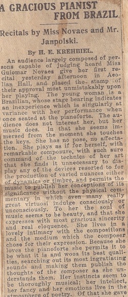The Beethoven and Schumann works are among her battle horses. In her first number the pianist was plainly much disturbed by nervousness, but in the sonata she began to disclose her true and valuable qualities. The Schumann composition without doubt reached complete measure of her musical abilities. It was the work which she played with credit for her entrance examination at the Conservatoire before Gabriel Faure, Claude Debussy, Moszkowski and other masters. (...) Her most prominent fault was an exaggerated rubato. She is now about 20 years of age and ought to become an important virtuoso. At any rate she is a welcome addition to the list of local acquaintances in the music world. ("Brazilian Pianist Makes Her Debut: Guiomar Novaes Successful in Exacting Compositions of Great Masters. Shows Genuine Talent" ,The Sun, loc.cit.)
