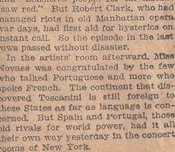 In the artists' room afterward, Miss Novaes was congratulated by the few who talked Portuguese and more who spoke French. The continent that discovered Toscanini is still foreign to these States as fas as language is concerned. But Spain and Portugal, those old rivals for world power, hat it all their own way yesterday in the concert rooms of New York. (loc.cit.)