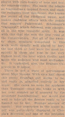 Segundo o crítico, a versão de Busoni da Chaconne de Bach seria até mesmo mais interessante do que a original, dada a vantagem do piano sobre o violino uma vez que possuia maiores possibilidades harmônicas. Ao invés de tocá-la novamente, como a platéia esperava, a jovem dera início ao seu próximo número, a sonata de Beethoven, que executara com rara beleza de sonoridade e expressividade terna. Ela teria interpretado o adagio com "flagrancia de uma flor tropical". Ela conhecia o segrêdo da pausa retórica. Nos efeitos que tirava do instrumento, lembrava Paderewski (1860-1941). O Carnaval de Schumann, com o qual alcançara o primeiro prêmio do Conservatório, fora por ela interpretado com um verdadeiro espírito romântico.