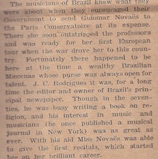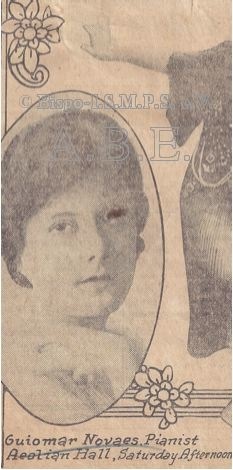 When I began to write my comments on the recital given in Aeolian Hall last Sunday by the greatest musician South America has ever produced - and one of the greatest of any country whatsoever - I hat on mind a definite point I wished to emphasize, but as my pen sped on I forgot about it and talked about something else. What I wished to say was that while the three foremost pianists of all time, Liszt, Rubinstein, and Paderewski, owed their super-excellence largely to the fact that they were creative musicians, here was a wonder pianist from Brazil, a young girl in the early twenties, who, without being creative, rivalled those players. Perhaps it would habe been a mistake to say this; for, possibly, Miss Novaes has composed some pieces for her instrument. If she has not done so, if would be extremely interesting to have her take some of the best folk tunes of her native Brazil and weld them into an epic, after the fashion of Liszt's Hungarian rhapsodies. ("Musical News And Gossip", The Evening Post Magazine, New York, Saturday, November 2, 1918, 8)