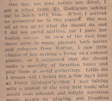 One day, not long before her début, I got a letter from Mr. Rodrigues asking me to lunch with him. When I arrived he presented me to this pianist. She was all at sea as to what she should do, and I did not mend matters, for I gave her foolish advice. In view of the fact that there were so many pianists, both native and refugees from Europe, I saw little chance of her making a living as a concert pianist; so I suggested that she should make a specialty of Brazilian tunes and play them at social gatherings. Little did I dream - till I heard her a few days later at Percy Grainger's - that I was talking with a pianist of the very first rank, who would soon astonish and delight American music lovers by playing, not Brazilian popular tunes, but the masterworks of Bach and Beethoven, Schumann, Chopin, and Liszt, and playing them in each case as one imagines those men played their works - or would have played them on a modern grand. (loc.cit.)