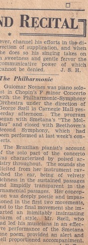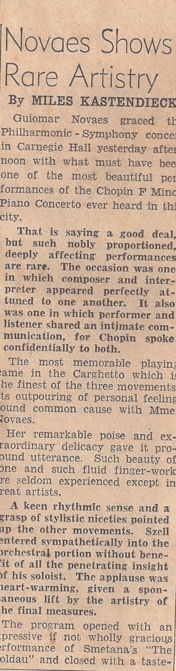 O seu artigo, de título "Novaes Shows Rare Artistry" (New York Journal-American, Mon., Jan. 8 1951, 10), iniciou-se com a afirmação de que a interpretação de Guiomar Novaes do Concerto em Fá menor de Chopin havia sido uma das mais belas já ouvidas em Nova Iorque. Compositor e intérprete estiveram unidos em perfeição, e entre a pianista e o ouvinte estabelecera-se íntima comunicação.