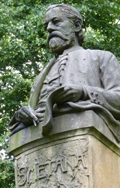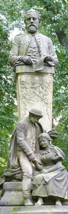 Aos pés do monumento, encontram-se duas figuras de sua ópera mais famosa, Jeníček e Mařenka. Esse fato, além daquele de ter-se designado o parque pelo seu nome, inscrito nas colunas que emolduram o portão de entrada, obra do arquiteto Václav Weinzetti, acompanhadas por duas águias, manifestam a consciência do significado de sua obra e de seu direcionamento estético pela passagem do século no país que então ainda fazia parte da Dupla Monarquia Áustro-Húngara.