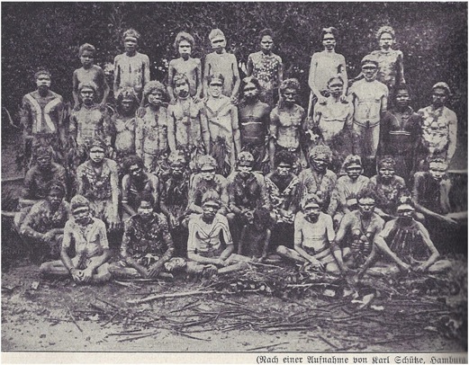 "A primeira impressão que ganhamos de um selvagem semi-sorridente, com a sua cor negro-carvão, os seus olhos brilhantes e penetrantes, com só uma fila de dentes, que se salientam desproporcionadamente de uma boca grande, aberta, foi a de que êle seria antes um pavinao ou uma criatura qualquer estranha desse novo mundo do que um ser humano. Um traje curto de couros de canguru, o costume resistente dos nativos, como constatamos mais tarde, era a sua única peça de roupa e alcançava até mais ou menos a metade de sua coxa, deixando descobertas as metades inferiores das pernas magras, disformes. Os seus braços eram magros mas fortes, como são em geral mais desenvolvidos entre os selvagens australianos do que os magros membros inferiores."