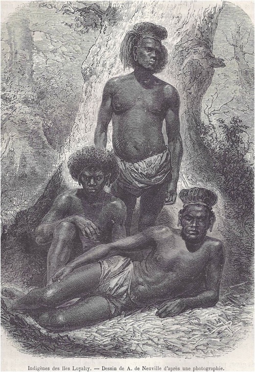 "Depuis que la Nouvelle-Calédonie est devenue un lieu de déportation, les sauvages Kanaques sont, dit-on, en voie de se civiliser quelque peu...Tant mieux, alors: car c'était bien tout ce qu'on peut imaginer de plus affreux que cette noire peuplade. Au physique d'abord: assez bien faits de corps, pourtant, mais d'une désagréable couleur de chocolat, ils ont les cheveux noirs, laineux, la barbe rude et crépue, le nez étaté, de grosses vilaines lèvres de nègres, saillantes et lippues, le front étroit et la tête aplatie; surtout des yeux ingectés de sang qui leur donnent un regard farouche. Les femmes sont beaucoup lus laides encore; accablées des plus rudes travaux, elles sont vieilles de bonne heure, et, alors, horribles." (Ch. Delon, op.cit. 227)