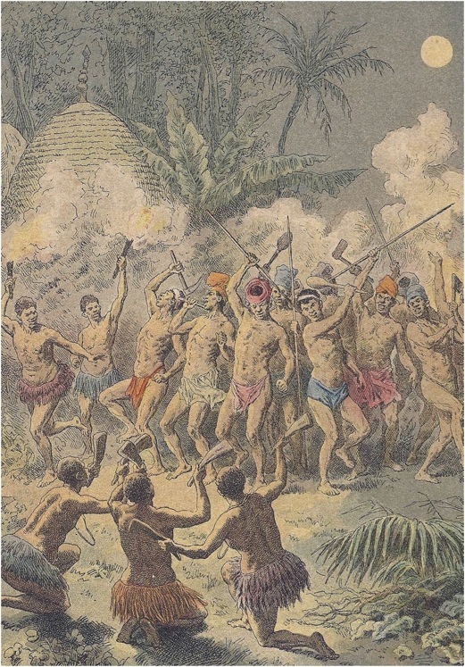 "Mais le trait le plus saillant de leurs moeurs est le cannibalisme. Là, voyez-vous, on mange de l'homme comme chez nous du boeuf ou du mouton. Nul remords, nulle honte: pourquoi, je vous prie? C'est si bon ! c'est de la viande. - Quand une tribu a besoin de viande, elle s'arme un beau soir, tombe sur la tribu voisine. Guerres effroyables, guerres de bêtes féroces, où l'on s'entre-dévore...Le vainqueur dine des vaincus." (loc.cit.)