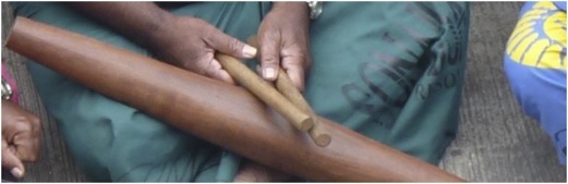 Esses incluem instrumentos de conotações locais, como o derua, tubos de madeira afunilados nas pontas, tocados com duas baquetas, que desempenha papel importante na manutenção do acompanhamento rítmico. Tudo indica que os antigos tambores canoa (lali) passam, aos poucos, a ter as suas funções reduzidas a sinalizações, tomando a si funções de sino nas comunidades, assim como desempenhando um papel de símbolo.