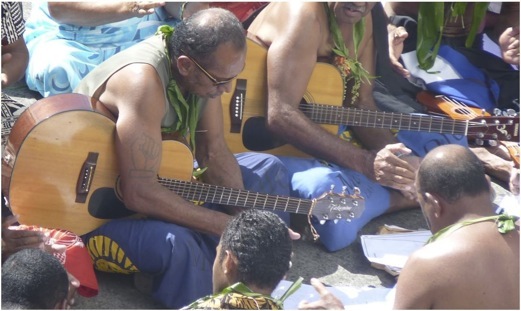 Assim como na Nova Caledônia, as encenações são acompanhadas por um coro constituido sobretudo por mulheres de mais idade, mas também por homens, que, em vez de se acompanharem com o Pé, como na Nova Caledônia, batem palmas. Esse coro, à parte, que comenta ou contraponteia em sentidos as cenas de luta com cantos que exprimem alegria, é acompanhado por músicos que executam diferentes instrumentos.