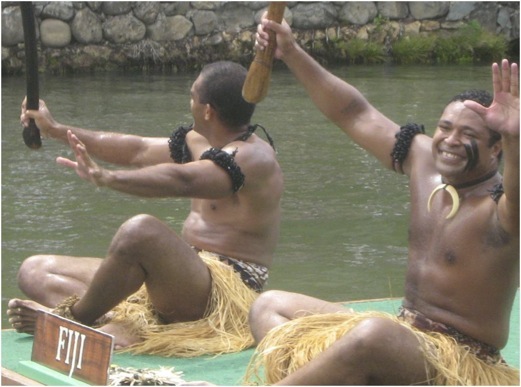 Em apresentações estilizadas do Centro das Culturas da Polinésia no Havaí, realizadas por estudantes, a presença de Fiji é marcada por expressões particularmente entusiásticas. Entre as representações das várias culturas do Pacífico, as de Fiji se distinguem por expressões extrabordantes de alegria e amplos gestos. (https://revista.brasil-europa.eu/125/Nobre_selvagem.html)