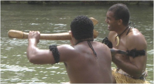 O que foi em Île de Pins apenas sugerido (https://revista.brasil-europa.eu/136/Dancas-dramaticas-Pacifico-Brasil.html), aqui a representação de lutas foi elucidada como referência histórica às dificuldades e aos riscos da viagem pelo mar da "grande canoa" que teria trazido os primeiros fijianos em remotas eras. O complexo da viagem e de chegada do próprio povo é aqui relacionado com o da viagem e chegada (ou partida) dos visitantes que são bem-vindos.